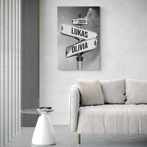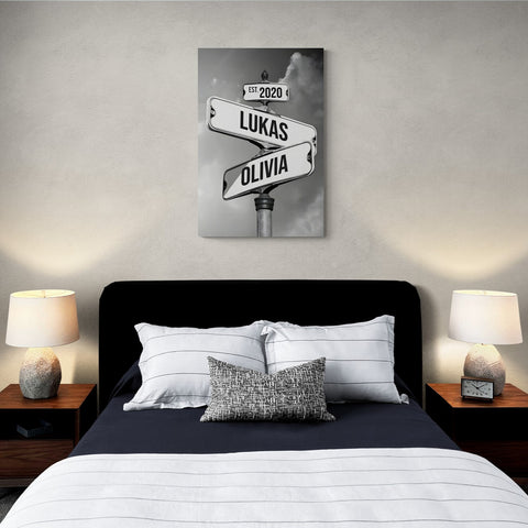 You have the opportunity to add your name and the date that marks a significant milestone in your relationship, thus creating a timeless memento in a vintage street sign style. This custom canvas is an exceptional gift idea for anniversaries, Valentine's Day, birthdays, or any other occasion that calls for a special celebration. Embellish your home with a touch of modern nostalgia encapsulated in our vintage-style canvas!
